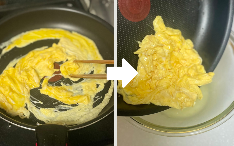 卵は加熱し過ぎると硬くなってしまいます。半熟状の卵をフライパンに戻したら、さっくりと混ぜる程度で火からおろすのがおすすめ。