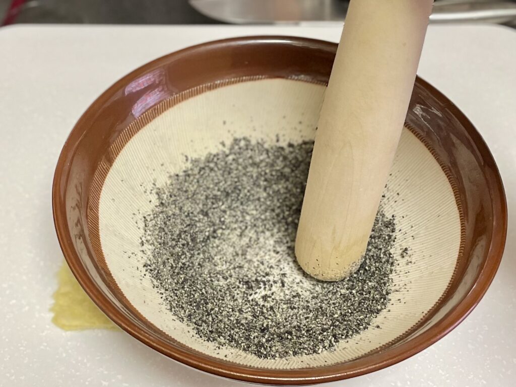 普段は白ごまを使うことが多い料理ですが、今回はあえて黒ごまを使用しました。