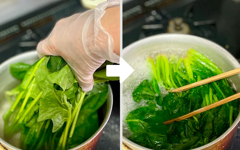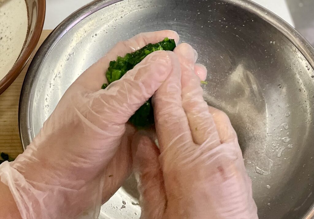 和える前に再度、“ぎゅっ”としっかり絞るのが、胡麻和え成功の鍵です。