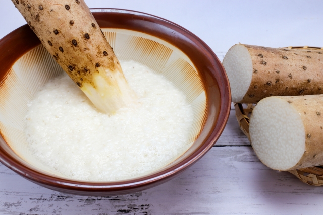 長芋は皮をむき、すり鉢、またはおろし金でする。滑らかになるまでよくすり混ぜる。