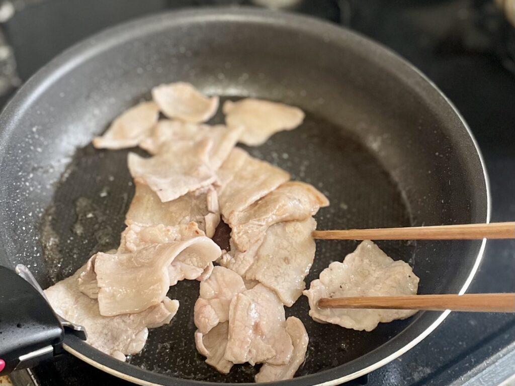 フライパンに油を熱し、豚肉を入れて中火で炒める。