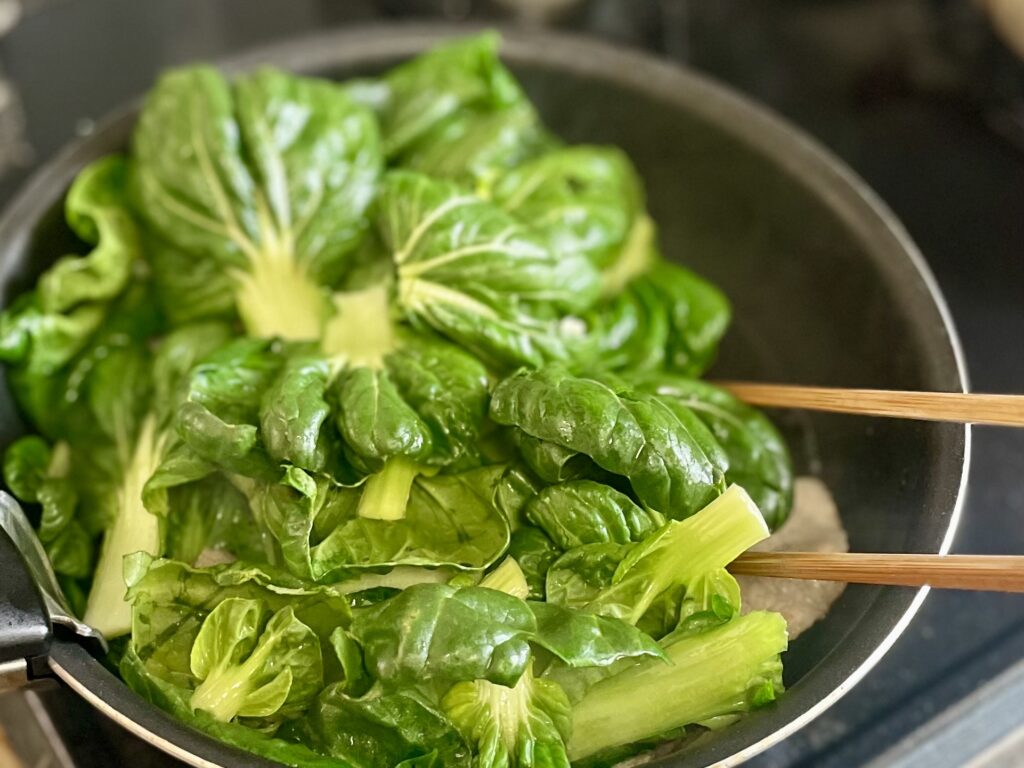 豚肉のうま味と油をまとわせることで、青菜特有の青さが和らぎ、コクのある味わいに仕上がります。
