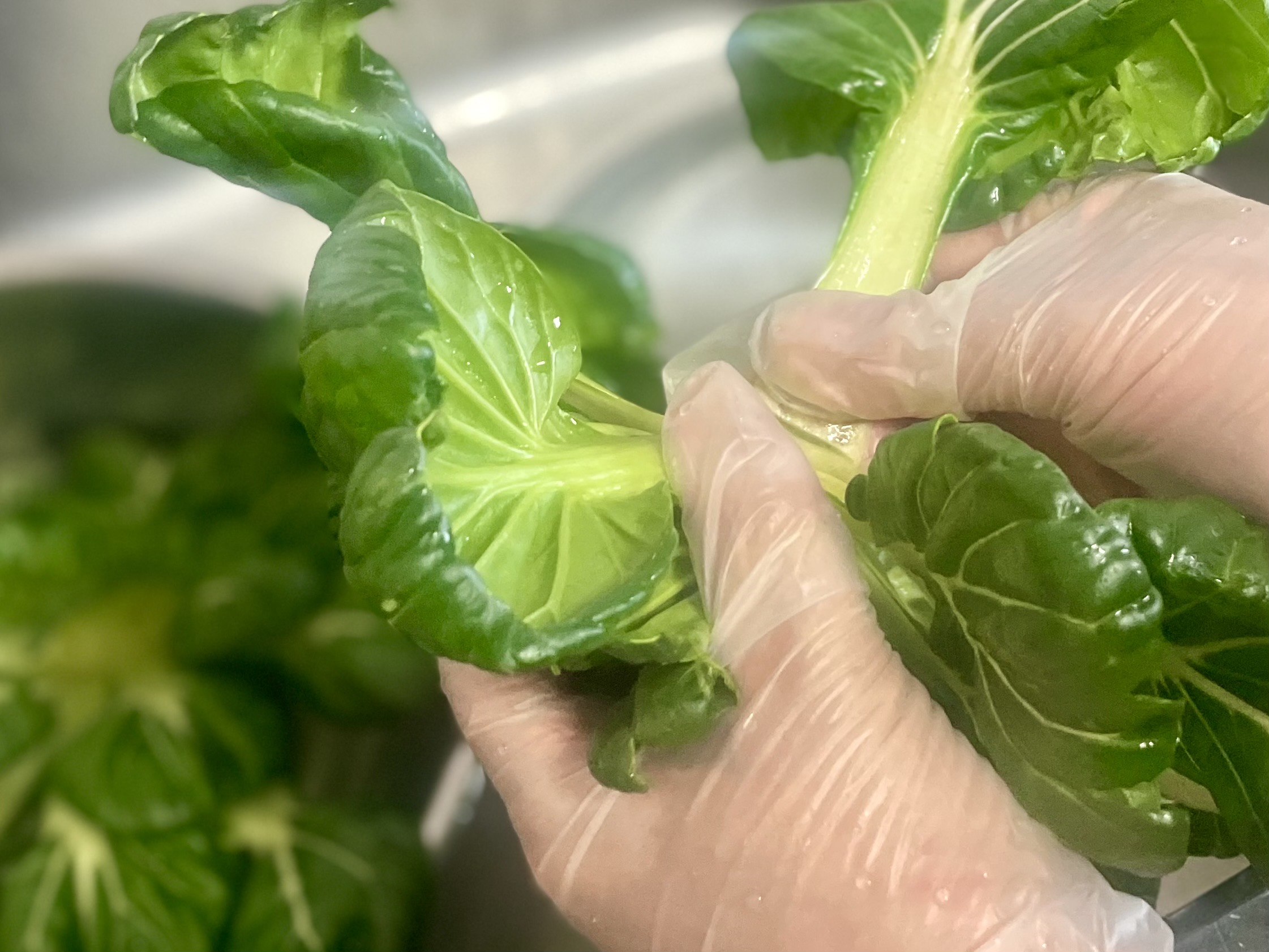 タアサイは根元を切り落とし、葉と茎を食べやすい大きさに切る。(横に広がったロゼット型のタアサイは、包丁で切らず、根元から一枚ずつ外して使う)