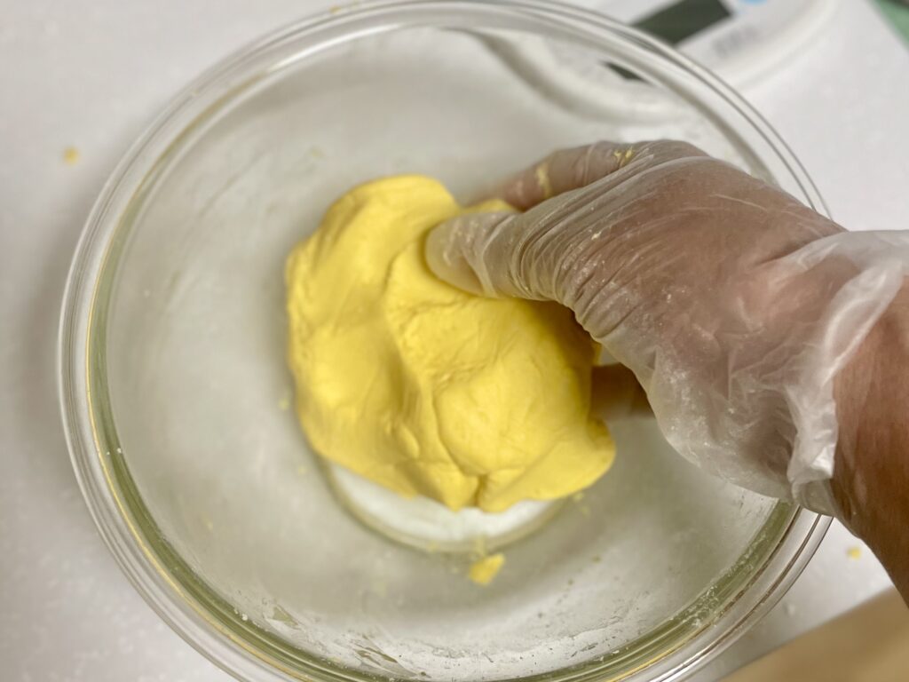 白玉粉にかぼちゃを加え、耳たぶ程度のやわらかさになるよう水を加えてこねる。