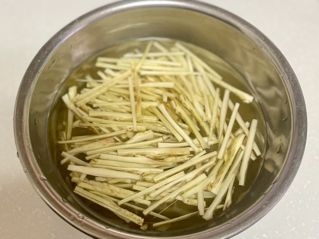 水に少量の酢(目安:水1カップに対して酢小さじ1程度)を加えた酢水に、1~2分ほどさらし、水を切る。
