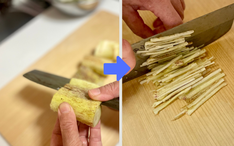 独活は4~5㎝の長さに切り、桂向きの要領で皮をむいて(少し集めでOK)、千切りにする。