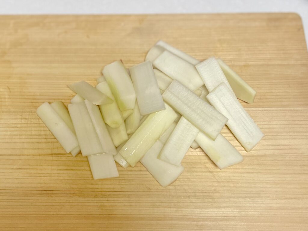 独活は皮をむき、4〜5cmほどの長さの短冊切りにする。(皮はきんぴらにすると美味しいです)
