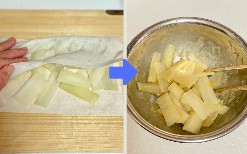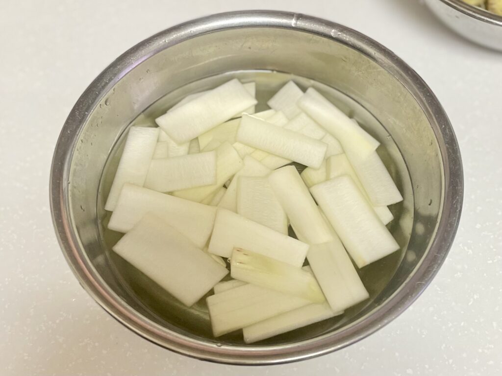 切った独活を酢水(または水)に5分ほどさらし、軽くアクを抜く。その後、ざるにあげて水気をよく切る。