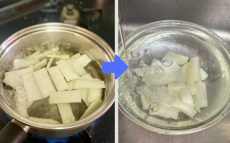 鍋に湯を沸かし、独活を30秒〜1分ほどサッとゆでる。すぐに冷水にとり、冷めたらすぐ引き上げて水気を切る。