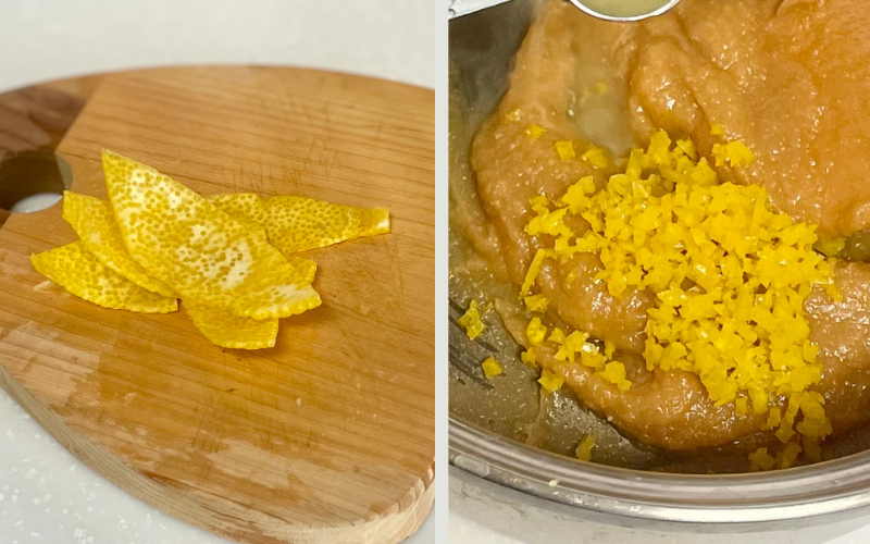 ゆずの皮は白いワタをできるだけ除き、細かいみじん切りにする。
