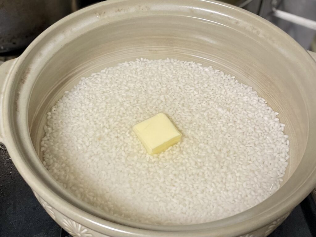 土鍋に米・白だし・水(合計350ml)・塩を入れ、軽く混ぜ、バターをのせて強火にかける。沸騰したら弱火に落として7〜8分炊く。