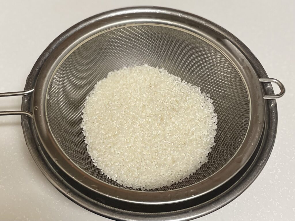 米を洗い、ザルに上げて30分ほど置いて浸水させる。