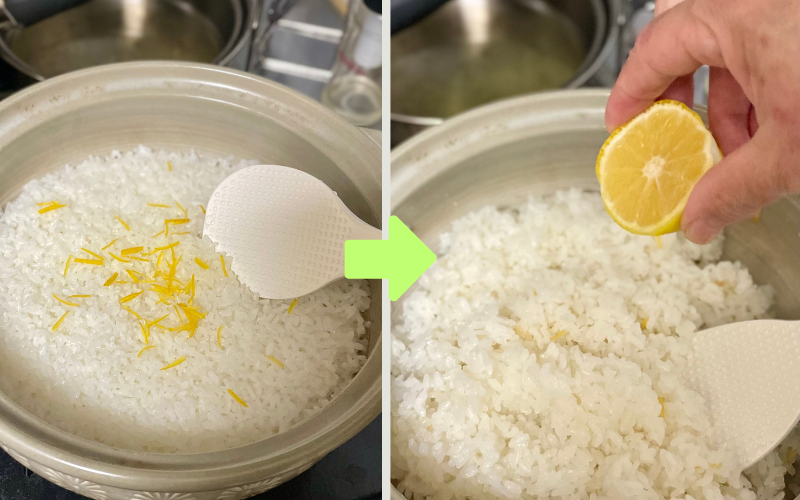蒸らし後、柚子の皮 → 柚子果汁の順に加え、しゃもじで切るように、さっくり混ぜる