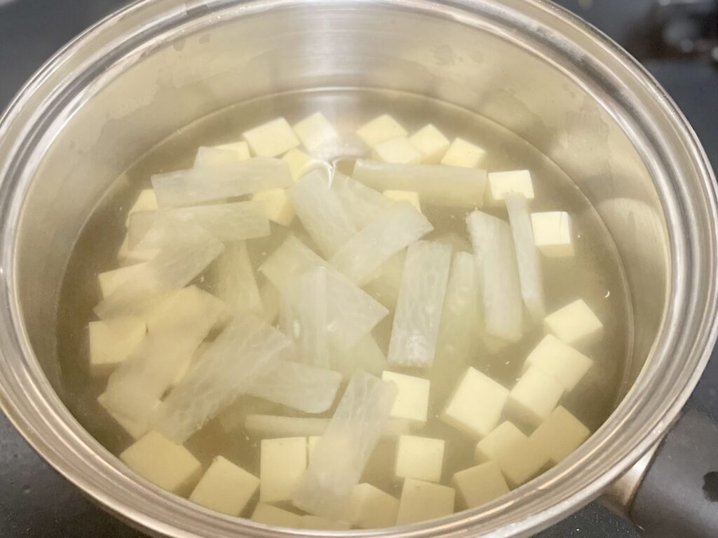 大根、豆腐を加えて温まったら、薄口しょうゆと塩でやさしく味を整える。