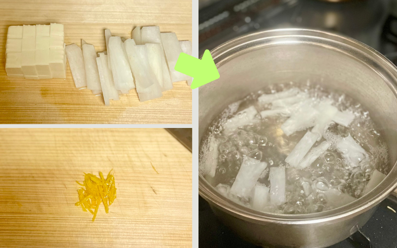 ・大根は細めの短冊切りにし、軽く下茹でして水気を切っておく。
